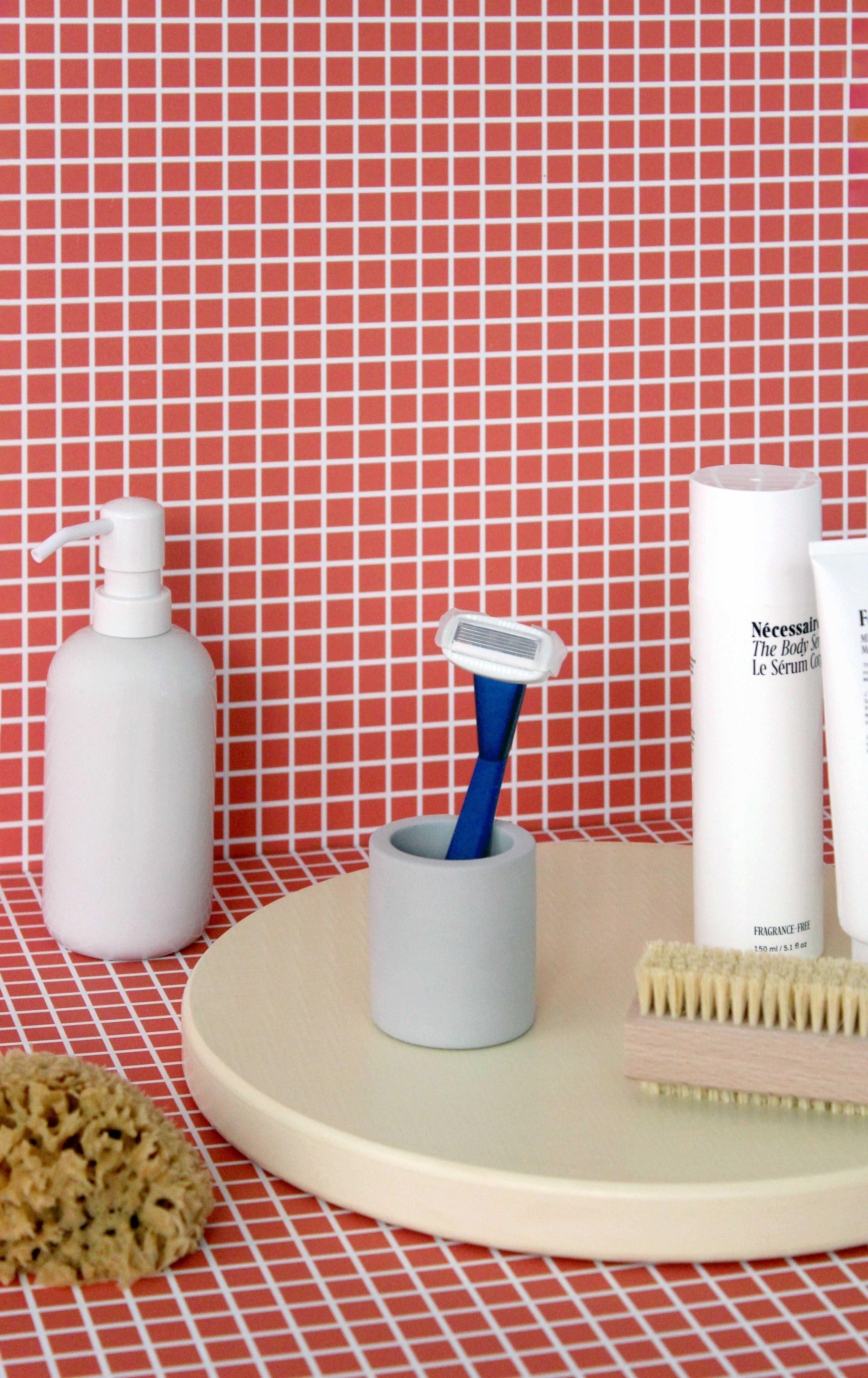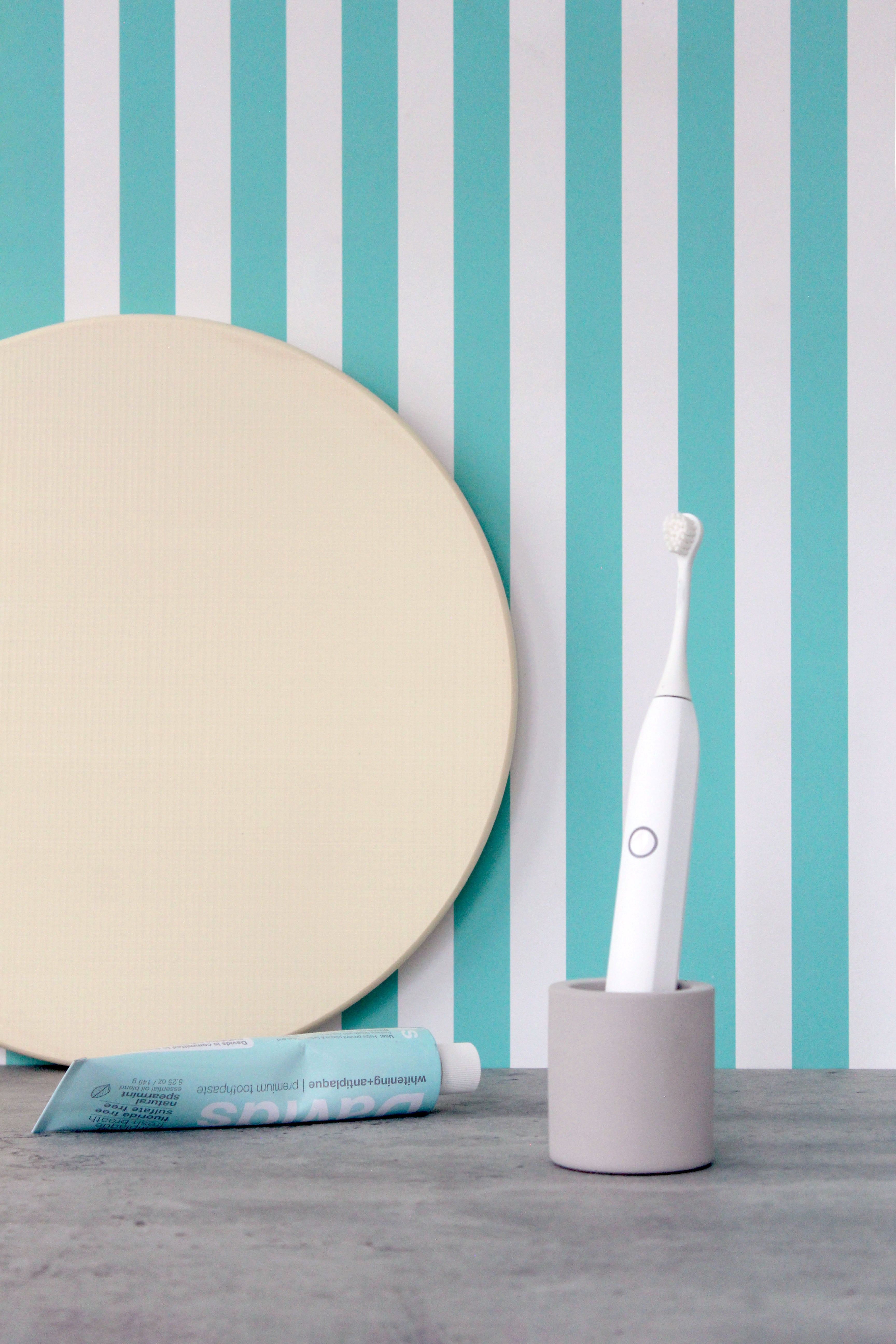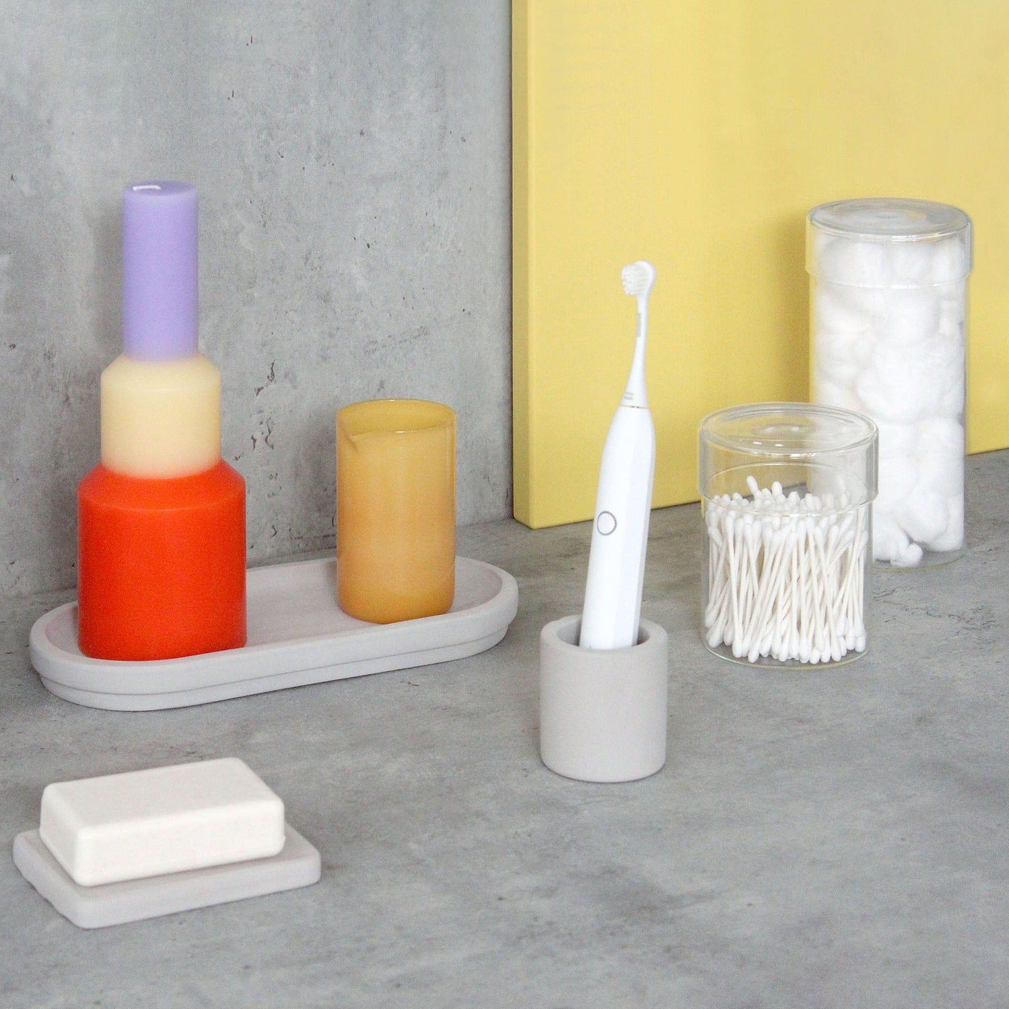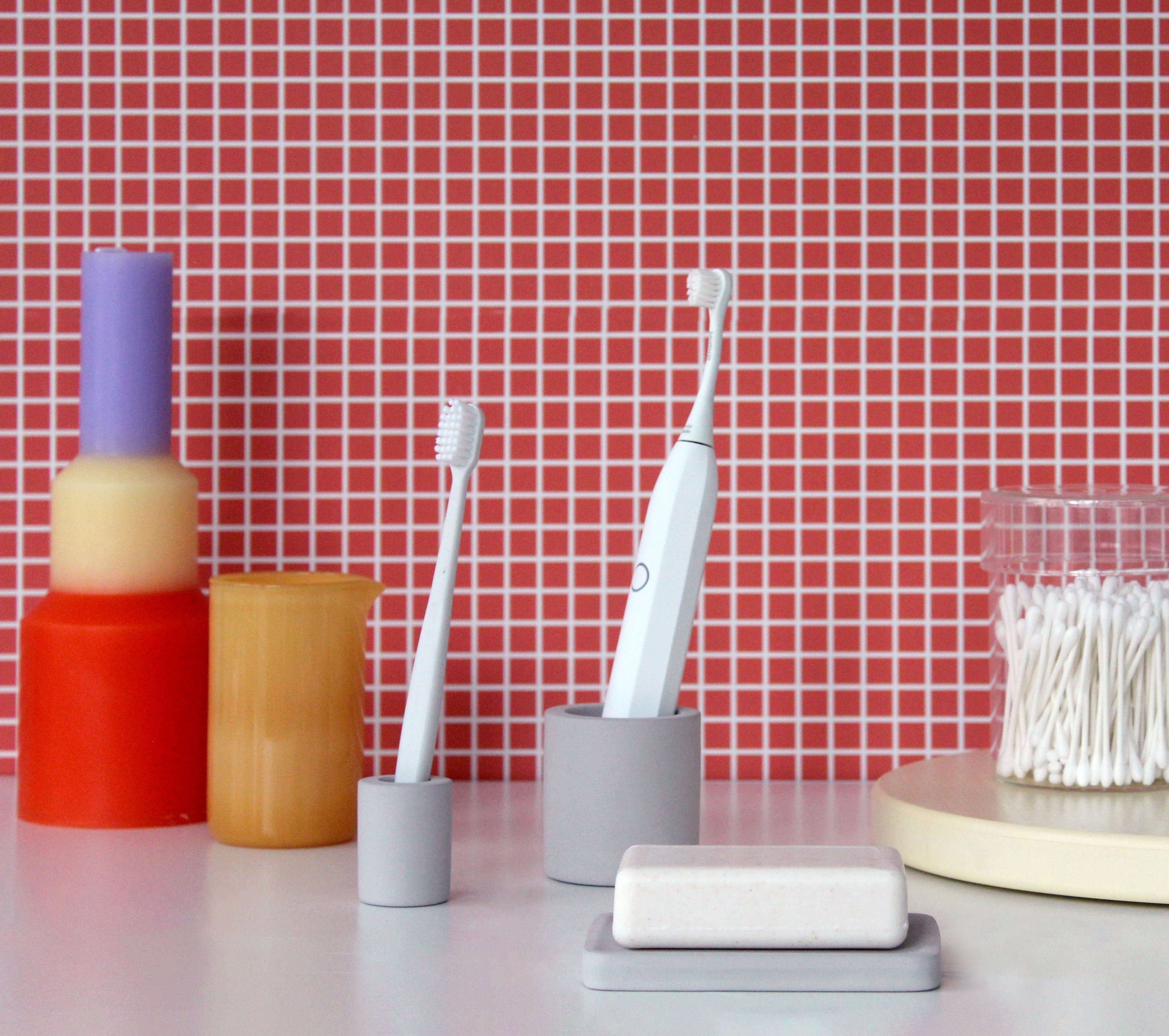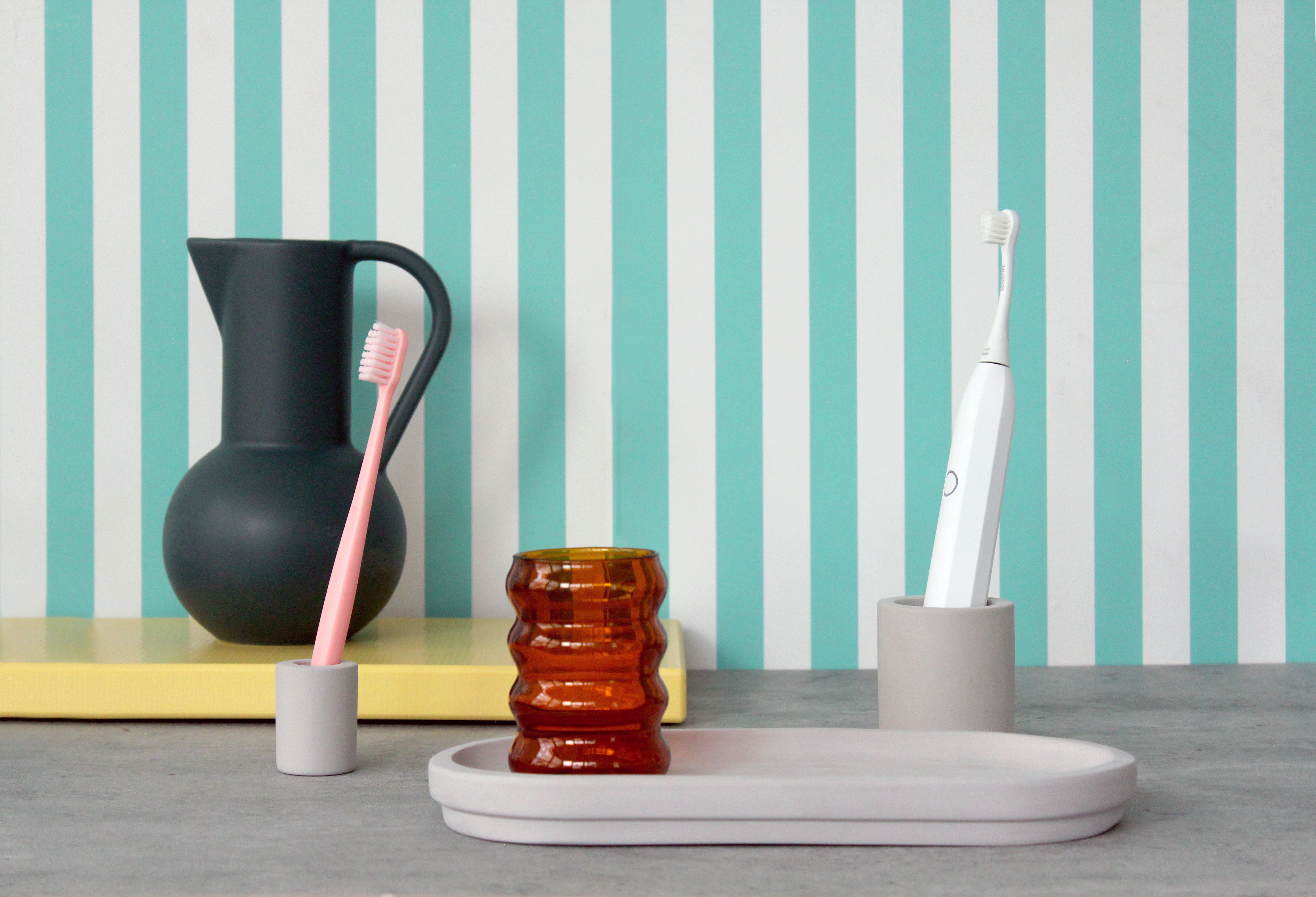A chic, minimalist electric toothbrush holder made of Diatomaceous earth, a natural stone that is both antibacterial and quick-drying